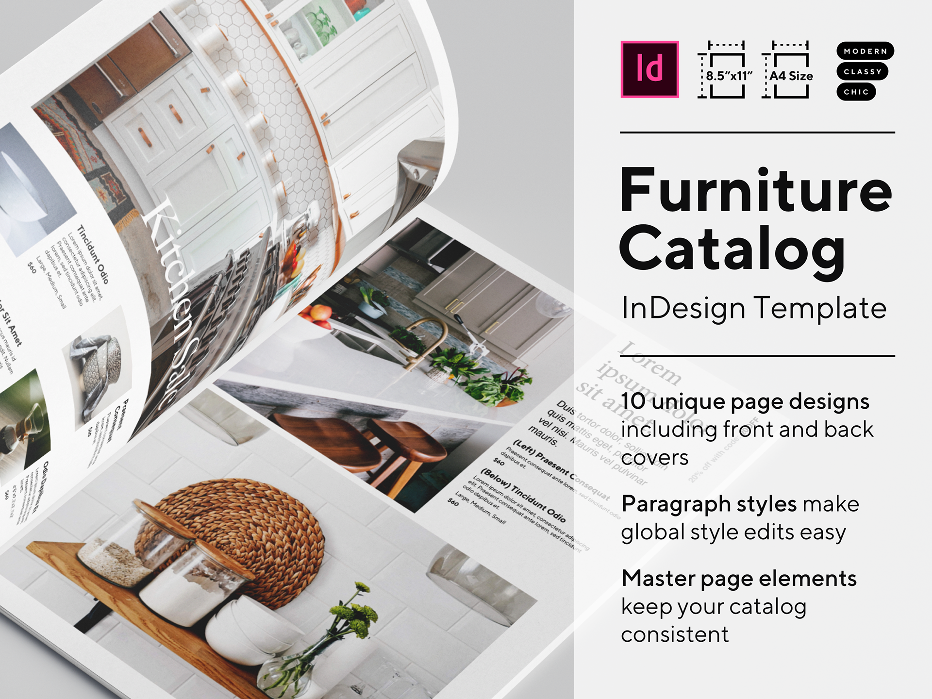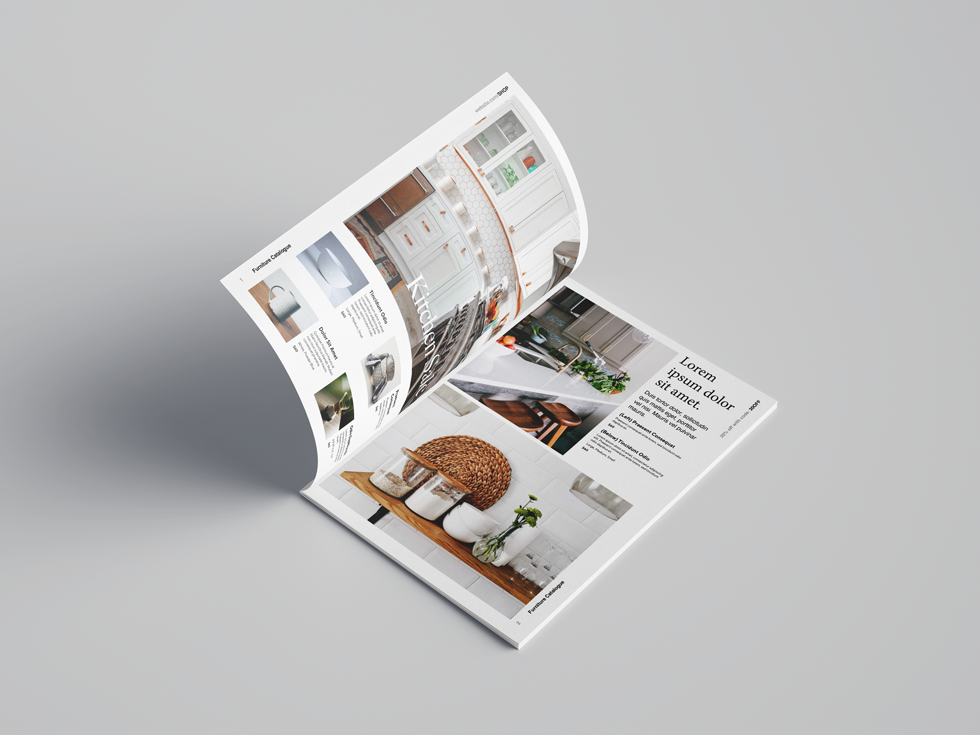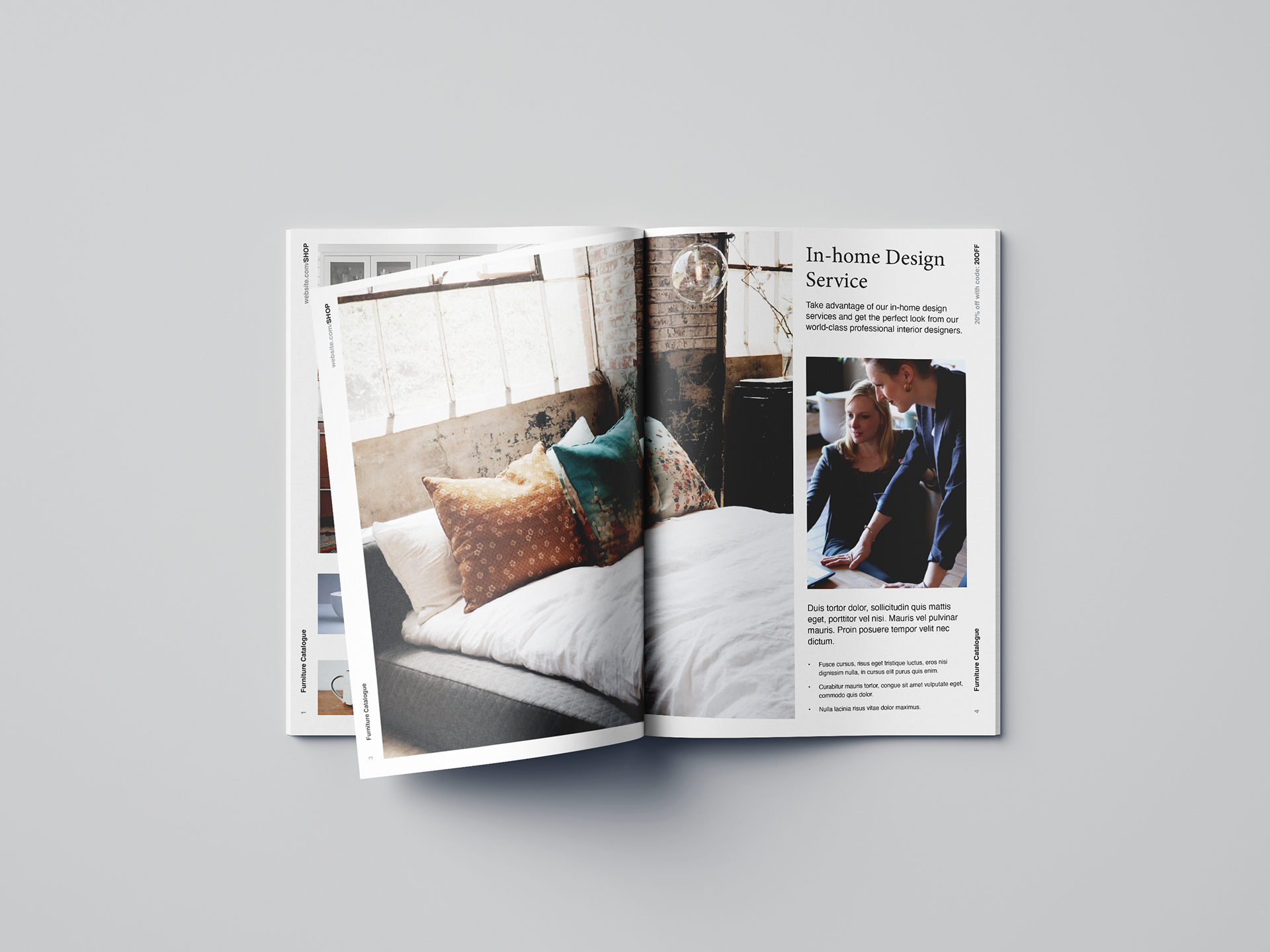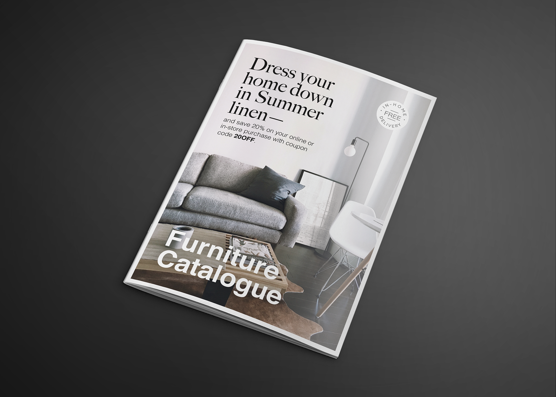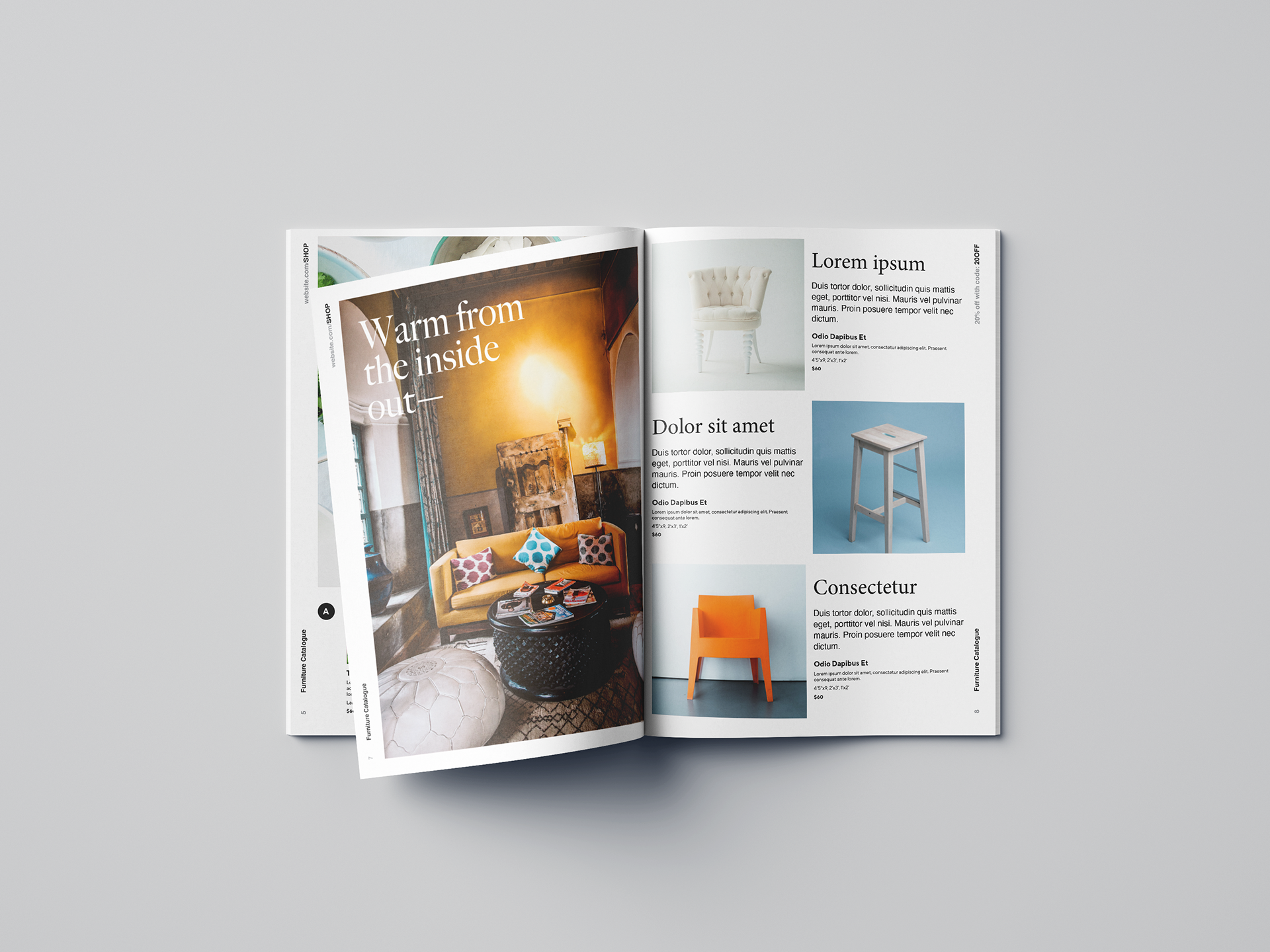 This modern, chic furniture and home decor catalog template is reminiscent of the attractive, minimal designs used by popular contemporary furniture brands.